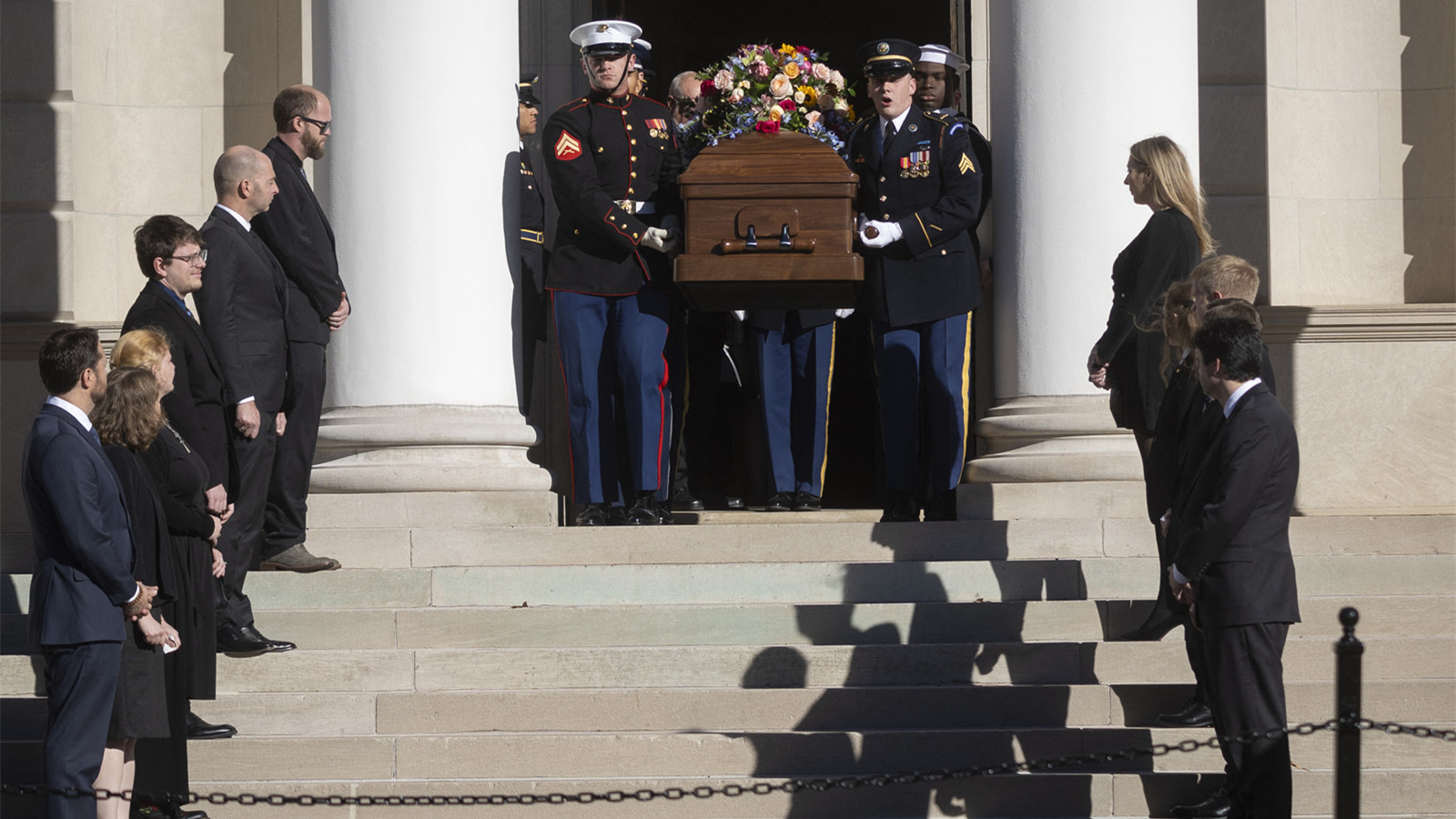 儀仗隊在儀式後將羅莎琳的靈柩送離教堂,卡特家族成員在旁送別。