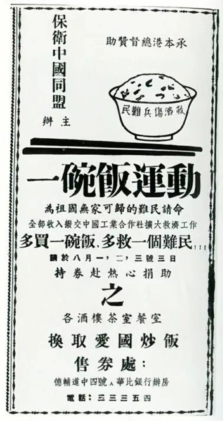 在香港「一碗飯運動」是人民認購價值2港元餐券,餐券價值本可享受幾道菜餚,但認購者只能持券到提供贊助的餐館吃炒飯一碗,差額盈餘交給中國工業合作社作為救濟西北難民的基金。