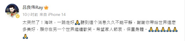 呂良偉發文哀悼,表示久久無法平靜(圖:呂良偉Ray@weibo)