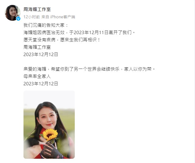延伸閱讀:周海媚去世|因病搶救無效 工作室發文於12月11日離世