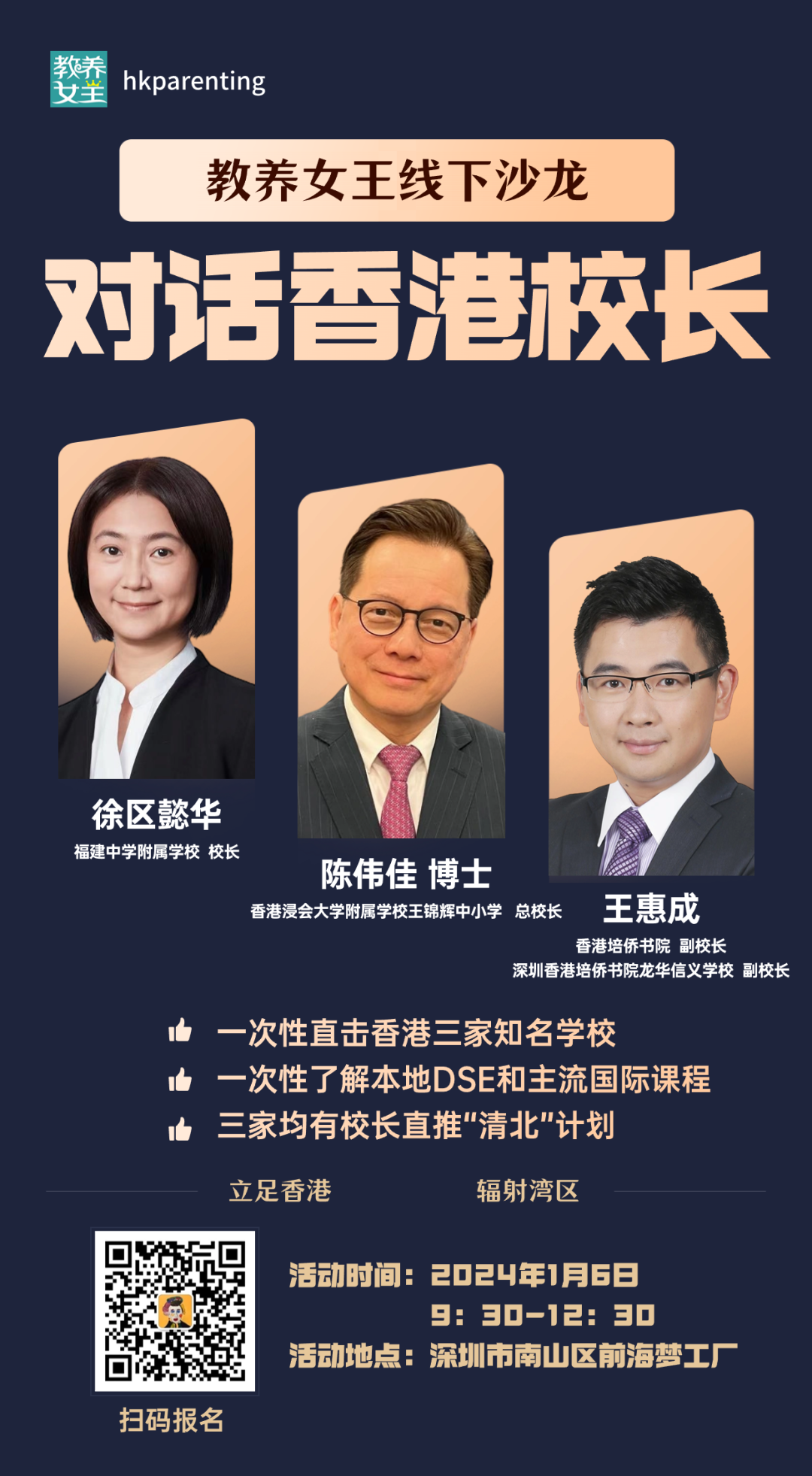 2024年1月6日,教養女王邀請到三所直資名校的校長來到深圳前海,參加「對話香港校長|教養女王線下沙龍」, 也是我們通關後第一場線下活動!