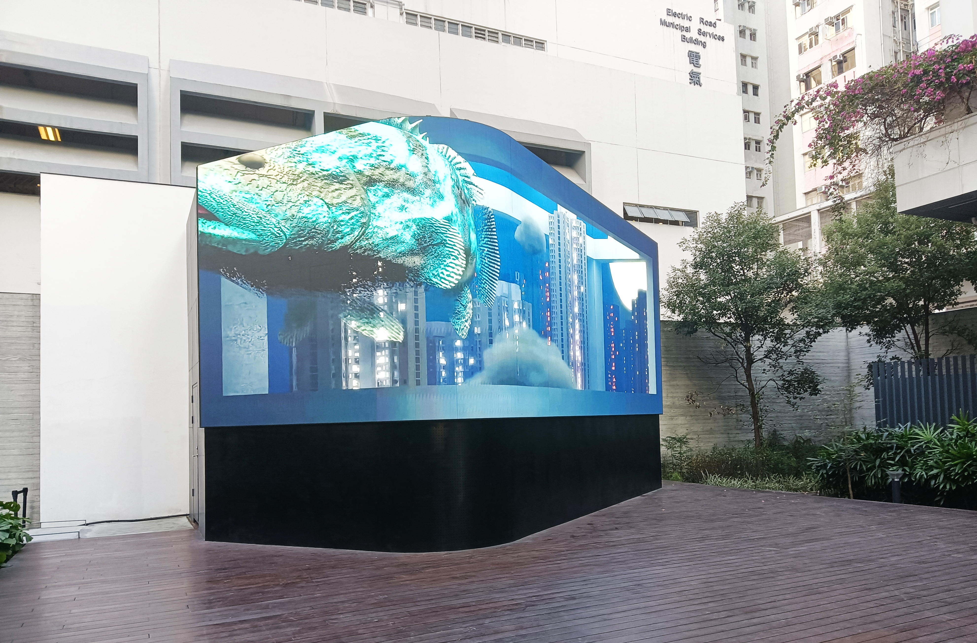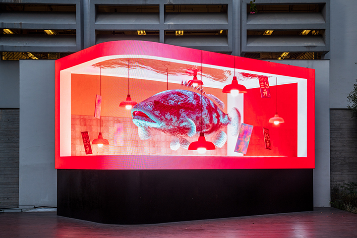 在九猴工作室的作品《飄流紀》中,熒幕化身大水箱,裝著一條巨大的沙巴龍躉。沙巴龍躉從街市的水箱中遊到金魚街,再遊到夜空下的高樓大廈之間,在冰冷都市中,它的身軀怪異而孤獨。