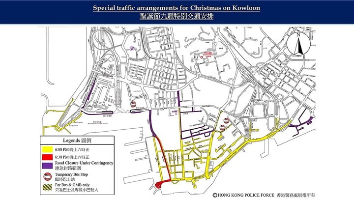 其中在尖沙咀,博物館道、廣東道、九龍公園徑南行、彌敦道、漆咸道南、梳士巴利道和紅磡繞道一帶的路段,會先在12月24日傍晚6時起封路,尖東摩地道巴士總站和中港城巴士總站會關閉;到傍晚6時半,天星碼頭一帶的路段,包括九龍公園徑的北行線和天星碼頭巴士總站亦會封路。三個巴士站的巴士線會改以九龍站為終點站。