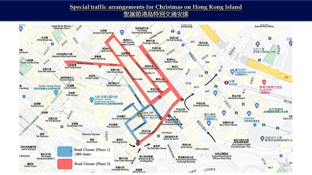 至於港島方面,蘭桂坊一帶道路,包括蘭桂坊、一段德己立街和威靈頓街等,會在平安夜當日下午兩時起會封閉,而視乎人流,警方會擴大封路範圍至擺花街、一段皇后大道中、史丹利街和閣麟街。