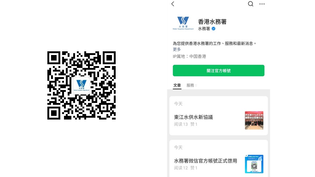 水務署啓用微信官方帳號,可掃瞄二維碼關注(左),目前共有兩篇文章可供閱讀。