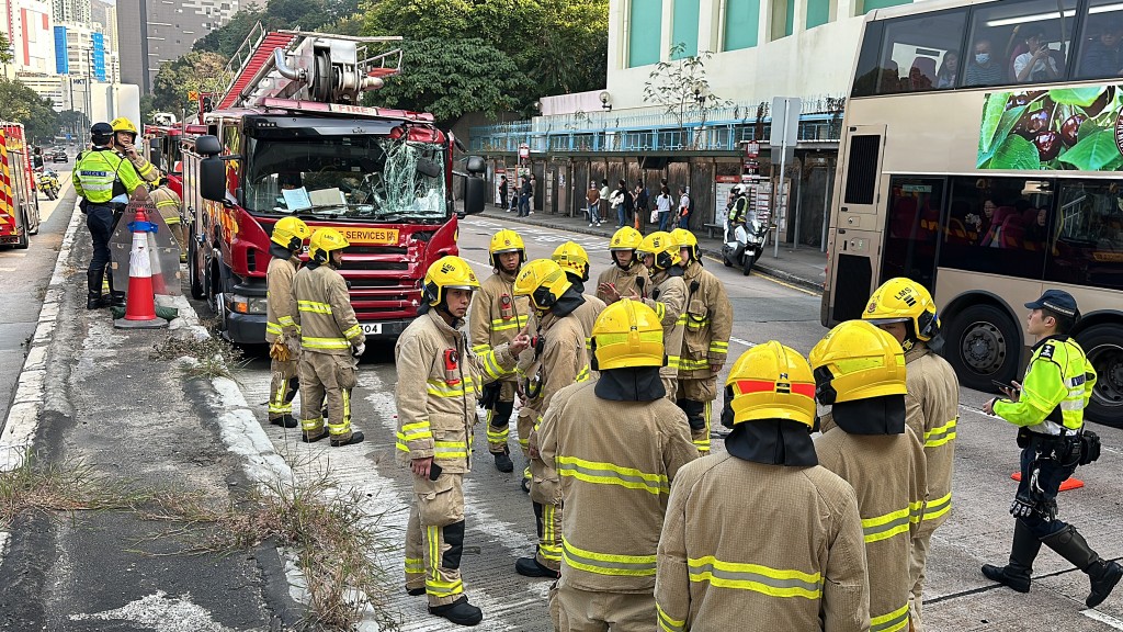 一輛消防車沿青山公路往屯門方向行駛,途至大窩口體育館對開時,與一輛巴士相撞。