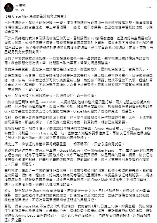 王陽翎最後公開向Grace Mak作最後通牒,要求一日內承認錯誤並向柳俊江的死鄭重道歉(圖:王陽翎@FB)
