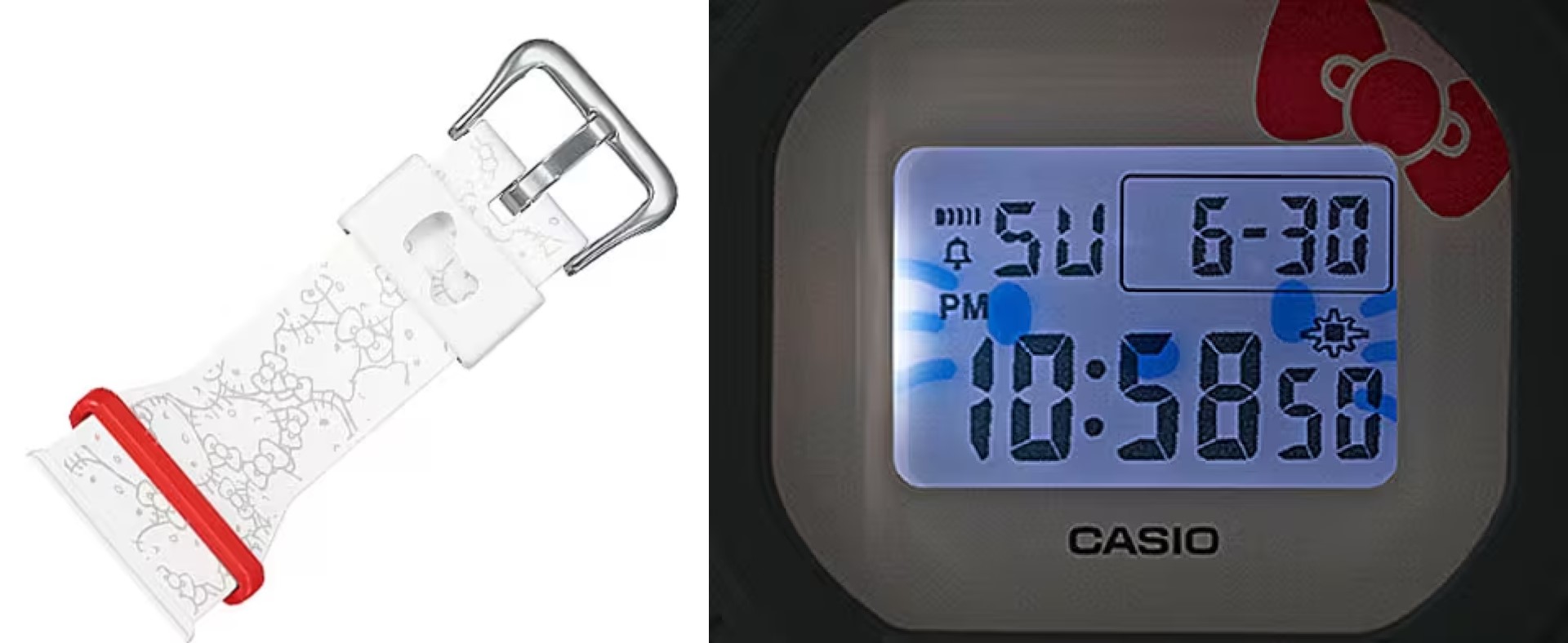 由生物基樹脂製成的錶帶上,印有HELLO KITTY的多個面貌:瞇眼笑、眨眼、露出驚訝表情、悲傷。當背光開啟時,HELLO KITTY的眼睛、鼻子和鬍鬚會出現在手錶的LCD屏幕上,這一點再加上錶盤上的飄帶設計,能夠展現出HELLO KITTY的整張臉。