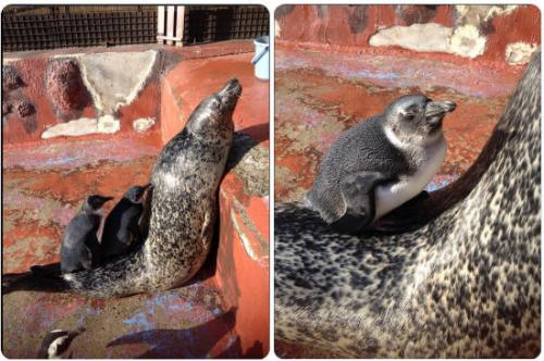 「海豹睡墊」照是動物園於9日上傳到Twitter,寫上「這是最近企鵝間最流行的行為」,從第一張照片中可見,一隻小企鵝瞇著眼睛,依企鵝身上打盹;隨後更有另外一隻接龍踩到海豹身上,從另一個角度來看,甚至還有一群小企鵝,等著「睡」海豹呢。