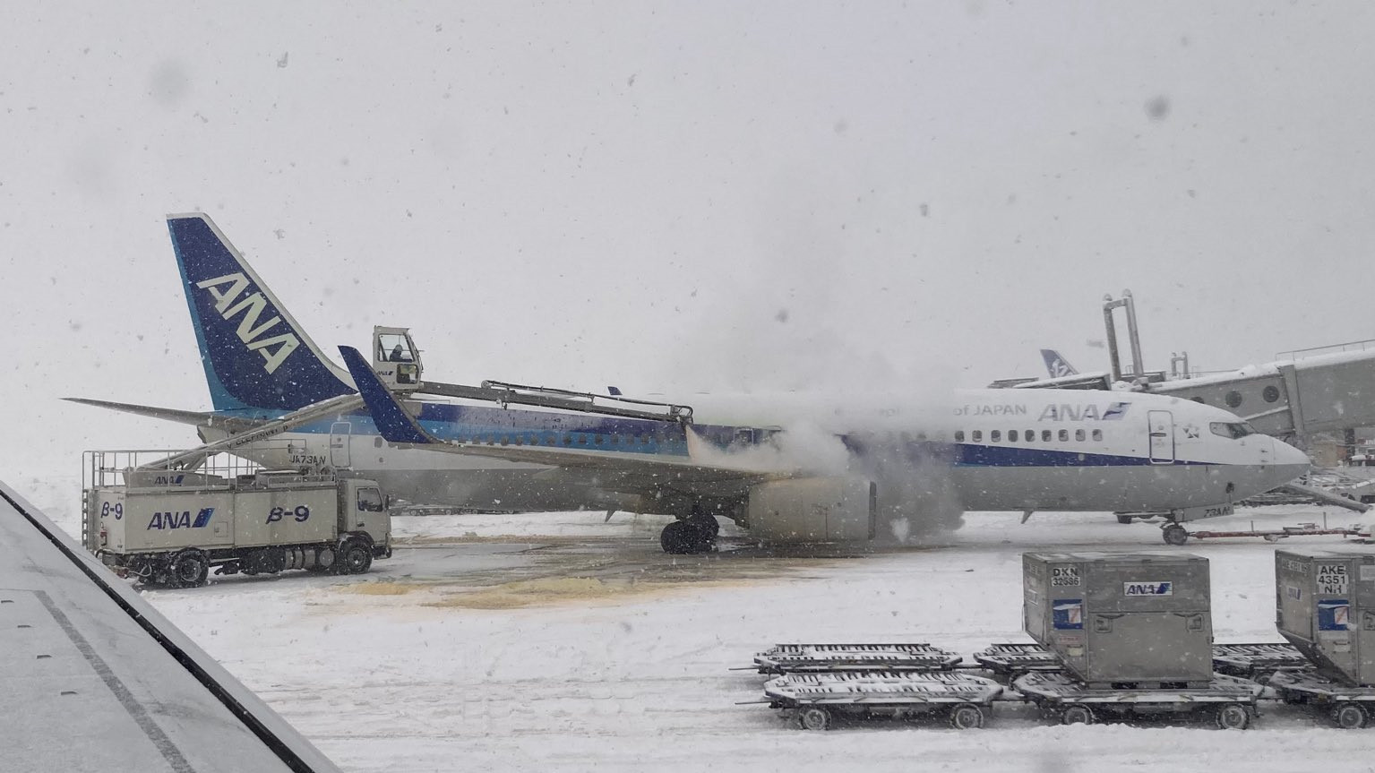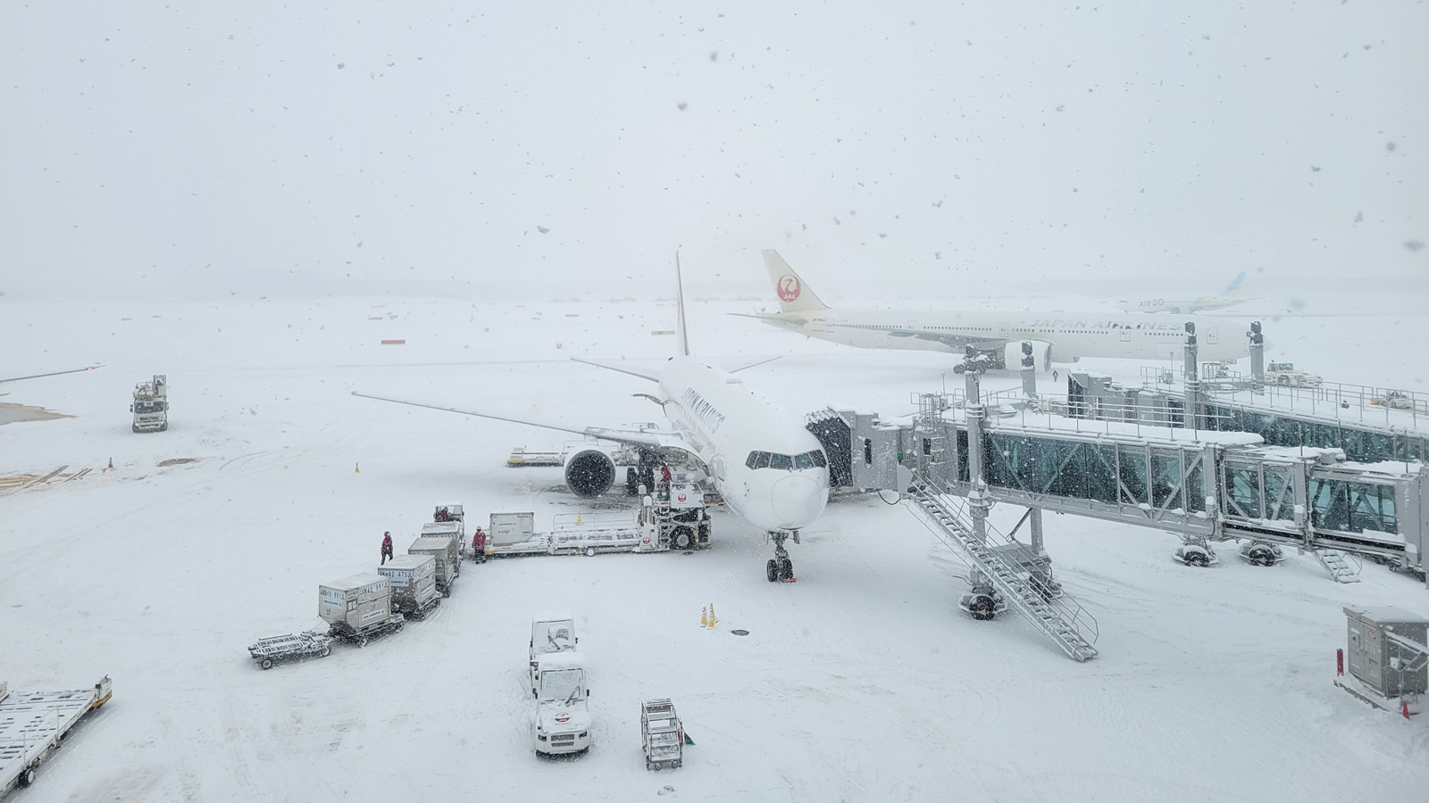 有在新千歲機場內的旅客拍下的照片顯示,全部機場跑道被大雪覆蓋,工作人員不斷向機身噴灑溶雪劑。該網民感謝機場人員在大降雪下仍然努力以赴,讓機場設施在惡劣天氣下仍然維持最大的運作。