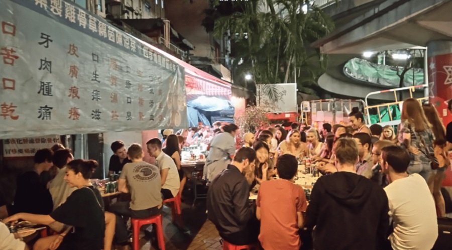 康樂餐廳位於奧海城往旺角的行人天橋底,日間經營街坊生意,餐牌與茶餐廳沒太大差別。但一到晚上,餐廳外小空地則會坐滿由外國來港的交流生及背包客,他們一邊吃港式小菜,一邊喝啤酒吹水,老闆更推出平價任飲任食「套餐」接待海外年輕人。
