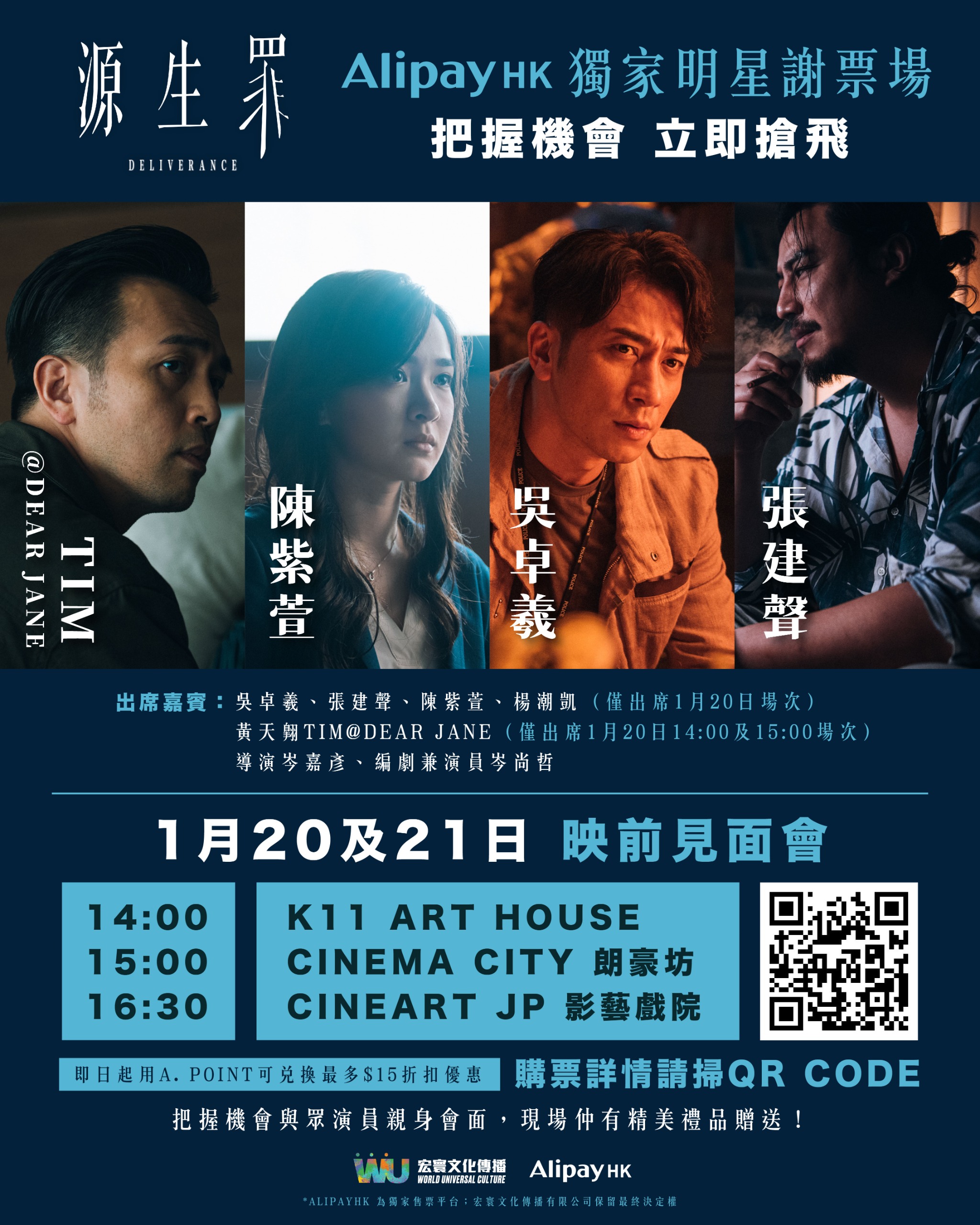 《源生罪》由黃永峯及鄧志玲聯手監製,荷里活回港新銳導演岑嘉彦與編劇岑尚哲「兄弟班」默契打造,雲集金像及實力派演員任達華、曾江、鮑起靜、吳家麗、吳卓羲、吳浣儀、張建聲,影壇新貴陳紫萱與新生代演員黃天翱(Tim@Dear Jane)、岑珈其、岑尚哲、阮頌揚,還有郭奕芯、楊潮凱、張滿源、黎學勤、余曉彤及安俊豪等特別客串。本片《源生罪》由宏寰文化傳播有限公司榮譽出品及發行,本周四(1月18日)香港隆重獻映。另外,本周末(1月20及21 日)將在尖沙咀K11 Art House、旺角朗豪坊 Cinema City及銅鑼灣翡翠明珠影藝戲院舉辦《源生罪》AlipayHK明星謝票場,AlipayHK 為獨家售票平台,用A. Point可兌換最多$15折扣優惠,詳情可點擊此處查詢。