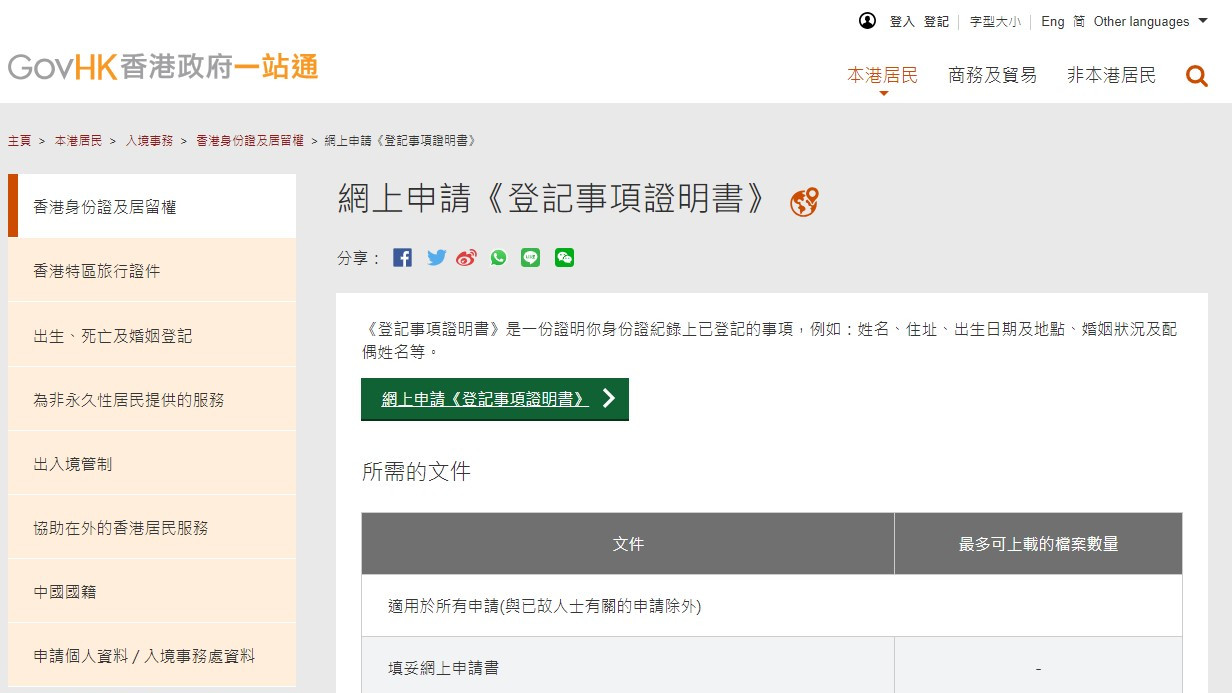 申請人即日起可在入境處網頁經網上申請《登記事項證明書》。
