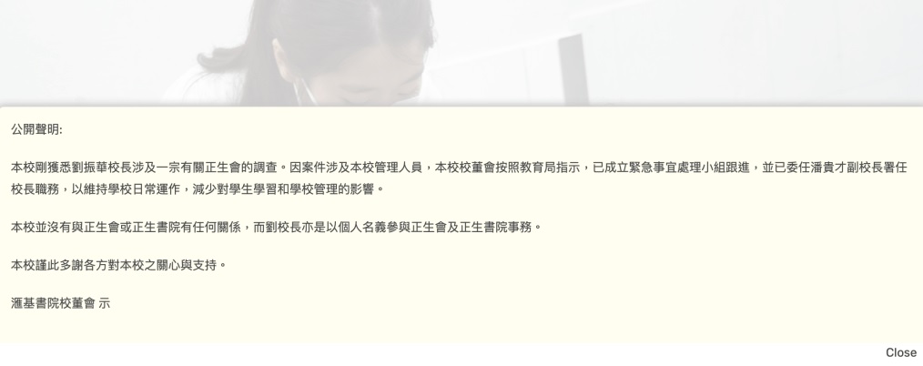 聲明指,滙基書院校董會剛獲悉現任校長劉振華涉及一宗有關正生會的調查,因案件涉及本校管理人員,校董會按照教育局指示,已成立緊急事宜處理小組跟進,並已委任副校長潘貴才署任校長職務,以維持學校日常運作,減少對學生學習和學校管理的影響。
