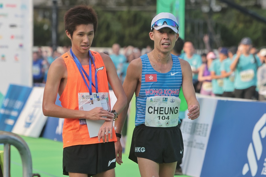 本地跑手黃尹雋(左)以2小時23分23秒完成全馬,成為今屆渣馬全馬最快的香港跑手,全場排第15位;張耀樑(右)以2小時24分51秒跑完今屆全馬,排全場第18位,也是第二快的香港跑手。