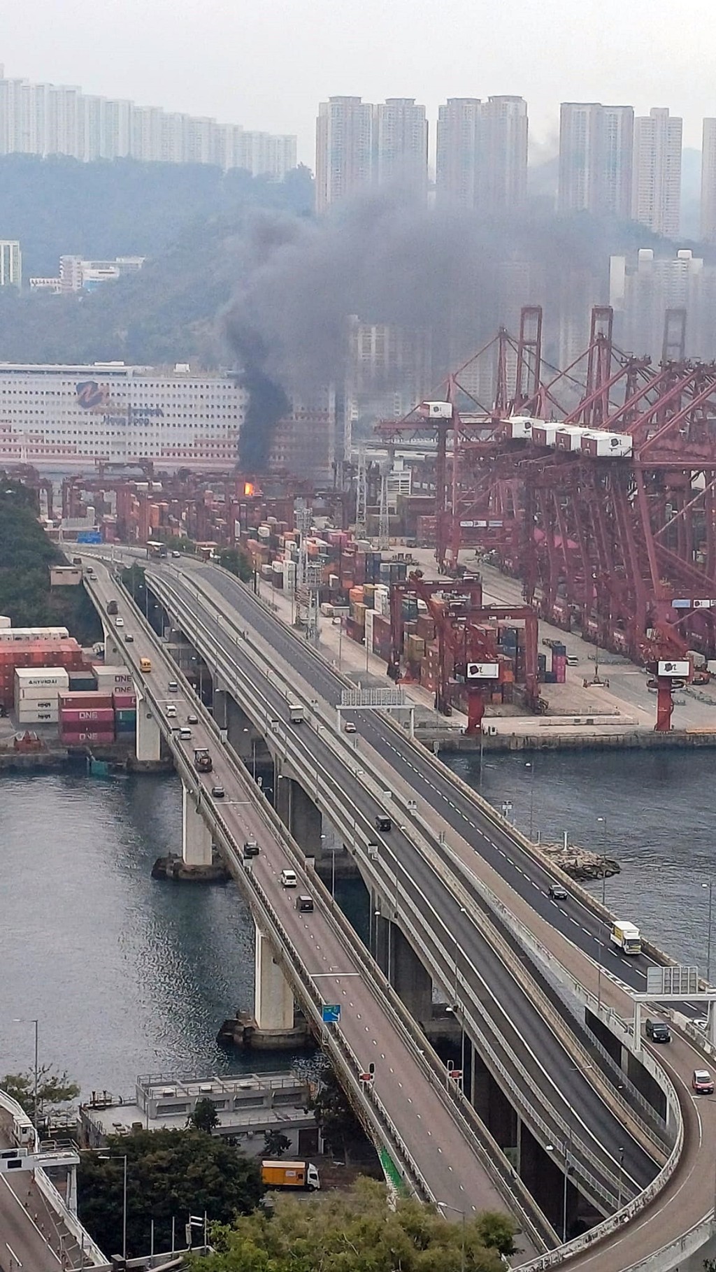 葵涌一號貨櫃碼頭冒出濃煙,火光熊熊。