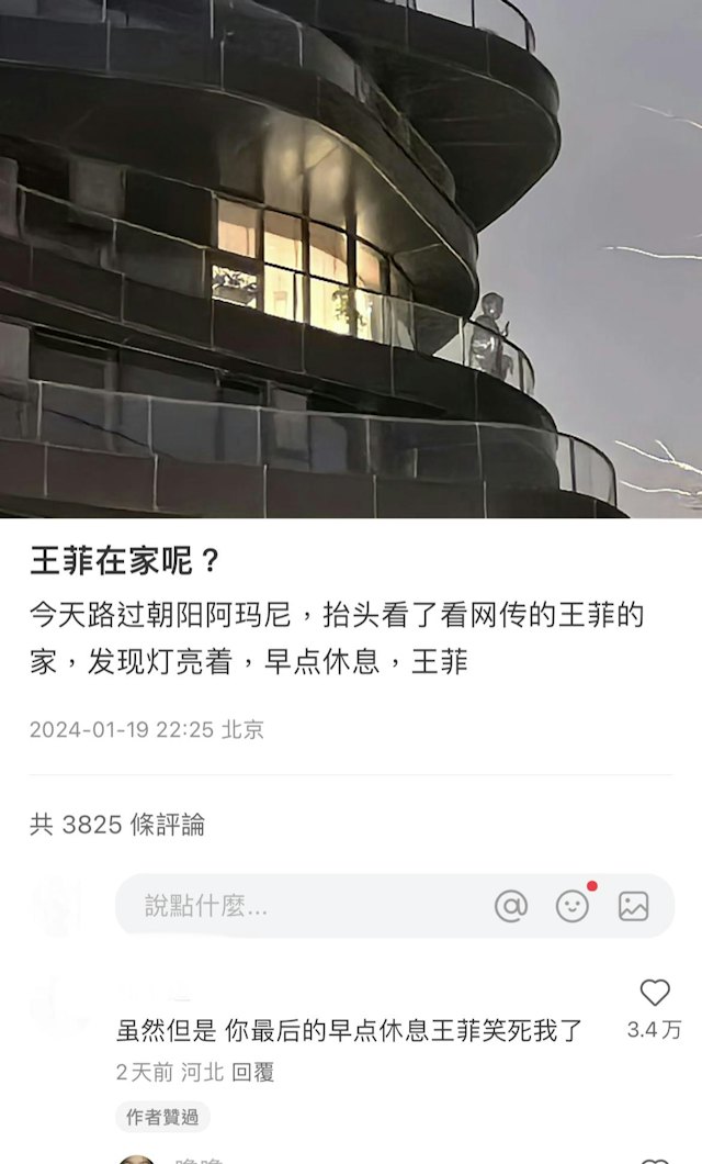 近日又有網民路過該處,並發文指見到該豪宅亮燈,網民發文指:「王菲在家呢?今天路過朝陽阿瑪尼,抬頭看了看網傳的王菲的家,發現燈亮着,早點休息,王菲」。