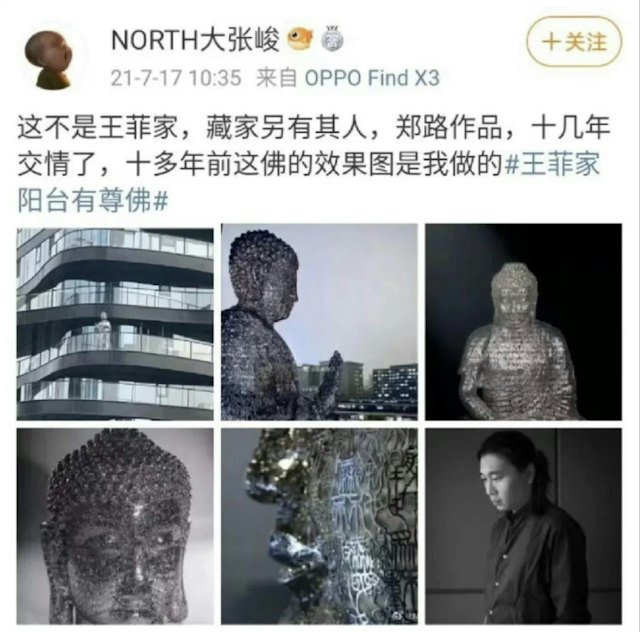網民笑言:「最後的早點休息,王菲。笑死我了」獲大批網民讚好。有人指以為佛像是王菲,「以為上邊這個人是王菲」、「這個佛挺詭異的沒人覺得嗎...」但實際上,早有自稱為該佛像製作效果圖的網民代發文澄清,指該豪宅並非王菲的住宅,「這不是王菲家,藏家另有其人,鄭路作品,十幾年交情了,十多年前這佛的效果圖是我做的#王菲家陽台有尊佛# 」。
