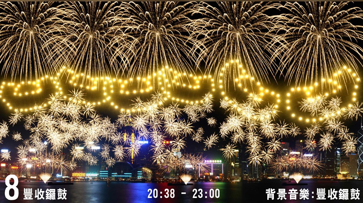 今次匯演共有八幕,歷時23分鐘,由三艘躉船在灣仔會展對開發放。其中第二幕「八星賀喜賀賀喜」會有「金色8字」和「紅色8字變爆裂」造型的禮花彈,如意廣大市民財源滾滾,同時亦有「笑臉」、「雙紅心」和「金元寶」等圖案造型煙花。最後更有30秒密集式發放的「特大錦冠」造型煙花。市民屆時可以在尖沙咀、半山、中區、灣仔、銅鑼灣及紅磡繞道等多處觀賞。