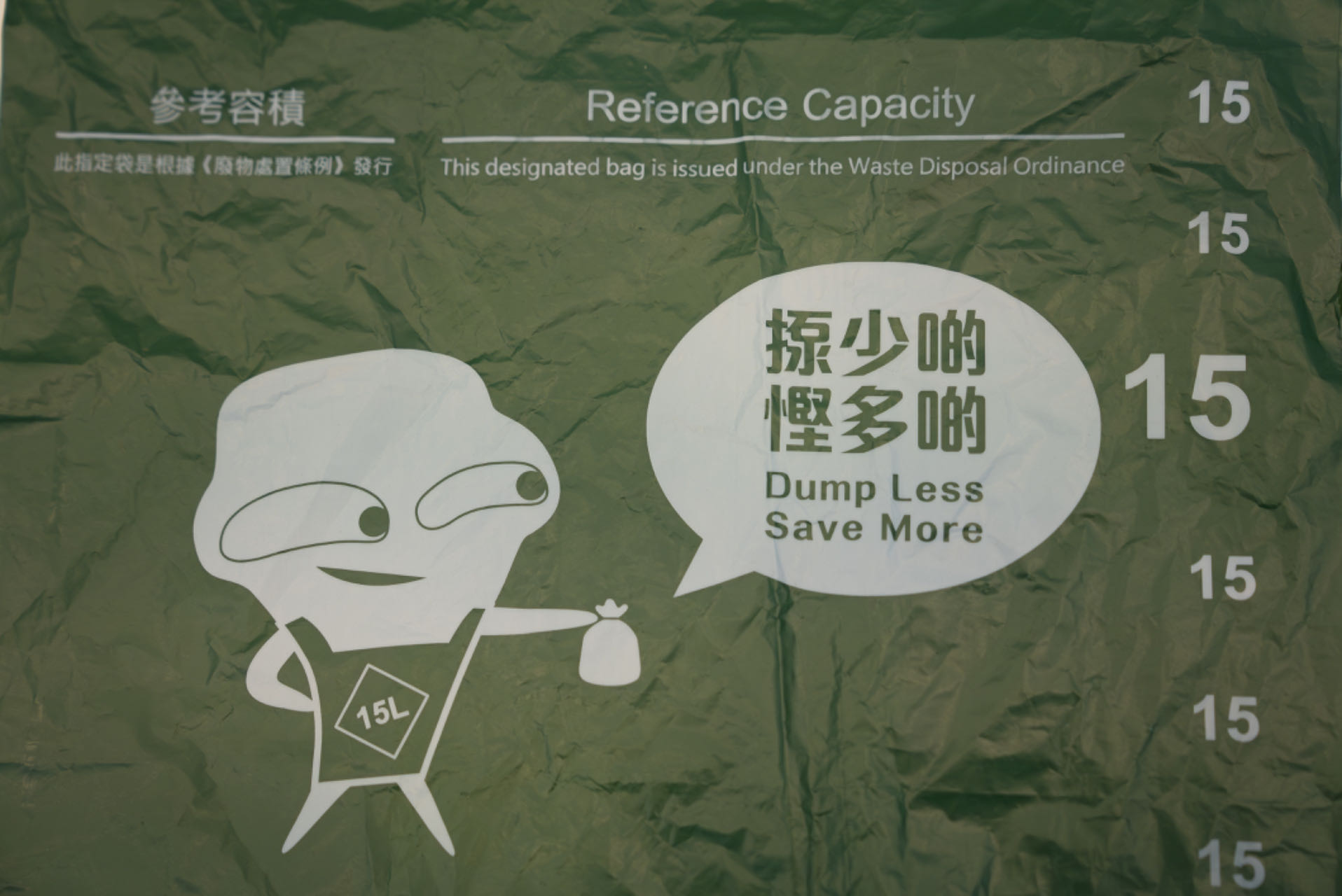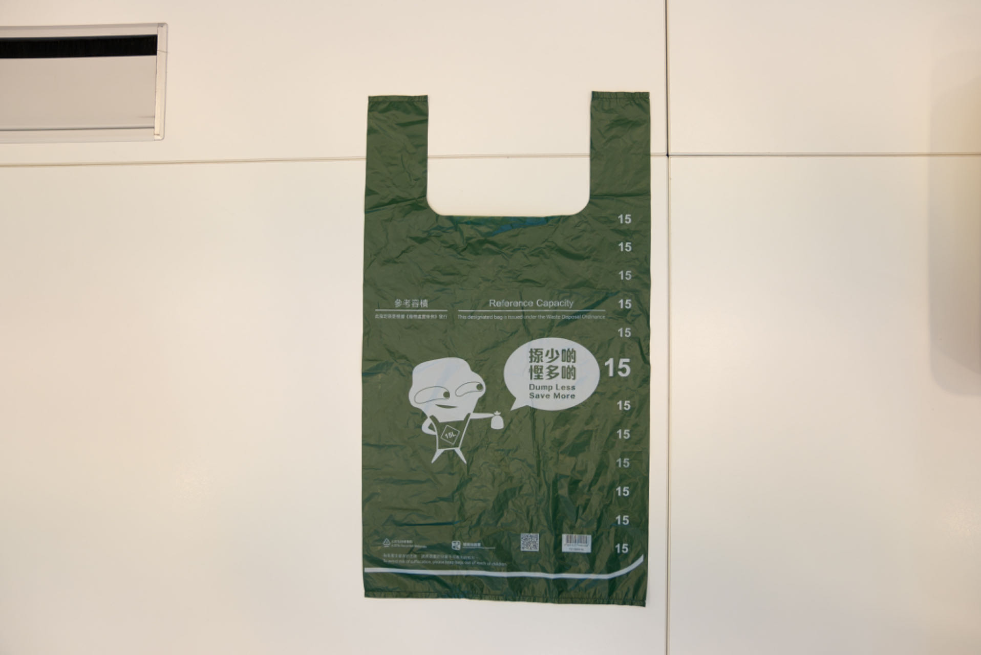 記者購買的是15公升容量的指定垃圾袋,整體為綠色、呈背心式樣,袋外亦印有二維碼,掃描後輸入指定袋批號即可查看詳情,包括指定袋種類、容量、售價及網頁信息。