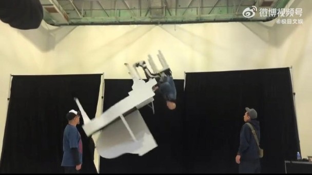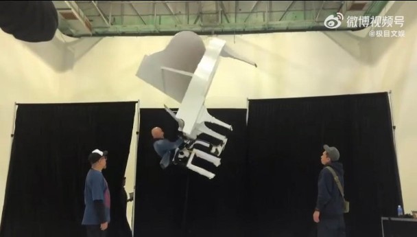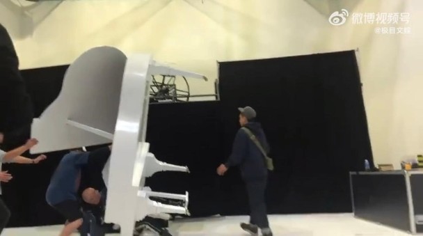 當中就有一幕為他與一座白色鋼琴綁在一起,懸吊至半空中,邊順時針旋轉(圖:微博)