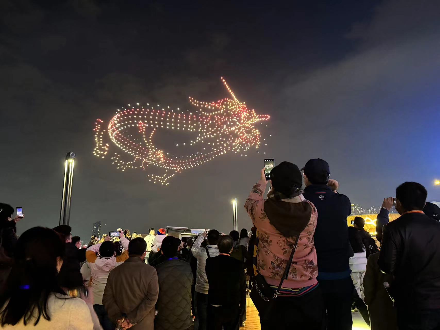 晚20點15分,上千架無人機層層疊疊,騰空而起,夜空中鋪展開一幅五彩斑斕的世界地圖,瞬間,五條光線從五大洲匯聚至南中國,香港座標閃閃發光、華麗登場。燦爛星河中躍入一條大魚,游至香港知名景點海洋公園,炫酷精美、夢幻靈動;流光四溢的城市地標維港天際線,空中與地上交相輝映,如夢似幻。機器人智慧魔方、粵劇花旦臉譜、蘭桂坊廟街等香港打卡點一一呈現,展現出東方之珠的獨特魅力,表達了特區政府和全港市民敞開懷抱、熱誠歡迎八方遊客的盛情。