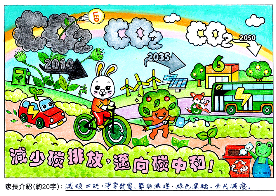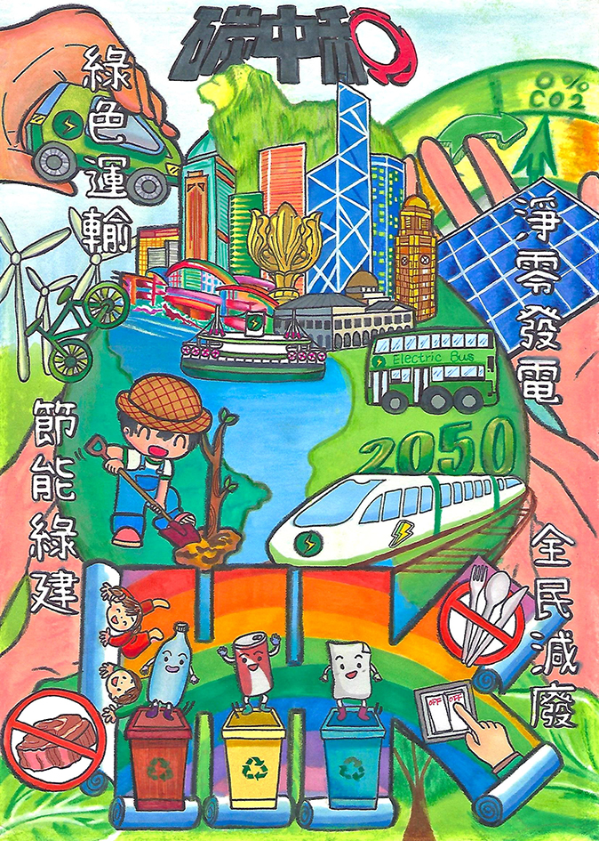高中組冠軍楊民逸在獅子山、天星小輪、尖沙咀鐘樓等四周繪上各式各樣的低碳生活方式,向港人作出減排減碳的呼籲。高小至初中組冠軍林泳瑜則以巧妙構圖把地球一分為二,凸顯環保生活為地球帶來的正面改變。