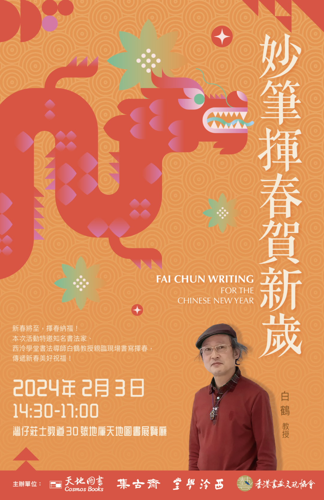 【橙訊】新春將至,揮春納福!值此辭舊迎新之際,「集古齋」攜手「天地圖書」、「西泠學堂」及「香港書畫文玩協會」,於2024年2月3日(周六)下午14:30至17:00在天地圖書展覽廳舉辦「妙筆揮春賀新歲」活動,特別邀請知名書法家、西冷學堂特聘書法導師白鶴教授親臨活動現場,即席揮毫書寫揮春,讓您近距離感受書法藝術的獨特魅力,為甲辰新春送上最美好的祝福!