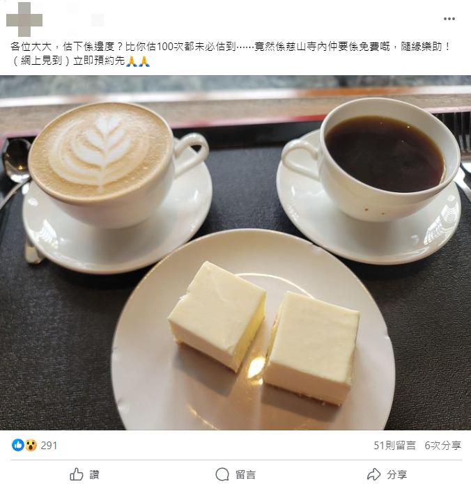 最近有網民在Facebook群組「香港茶餐廳及美食關注組」發佈了一張打卡照,圖中有一杯咖啡,一杯拉花咖啡以及一碟芝士蛋糕,並配文「各位大大,估下係邊度?比你估100次都未必估到⋯⋯」樓主開估美食並非來自咖啡店,而是大埔慈山寺內的免費食物,不過需要預約,靠參觀的施主隨緣樂助。