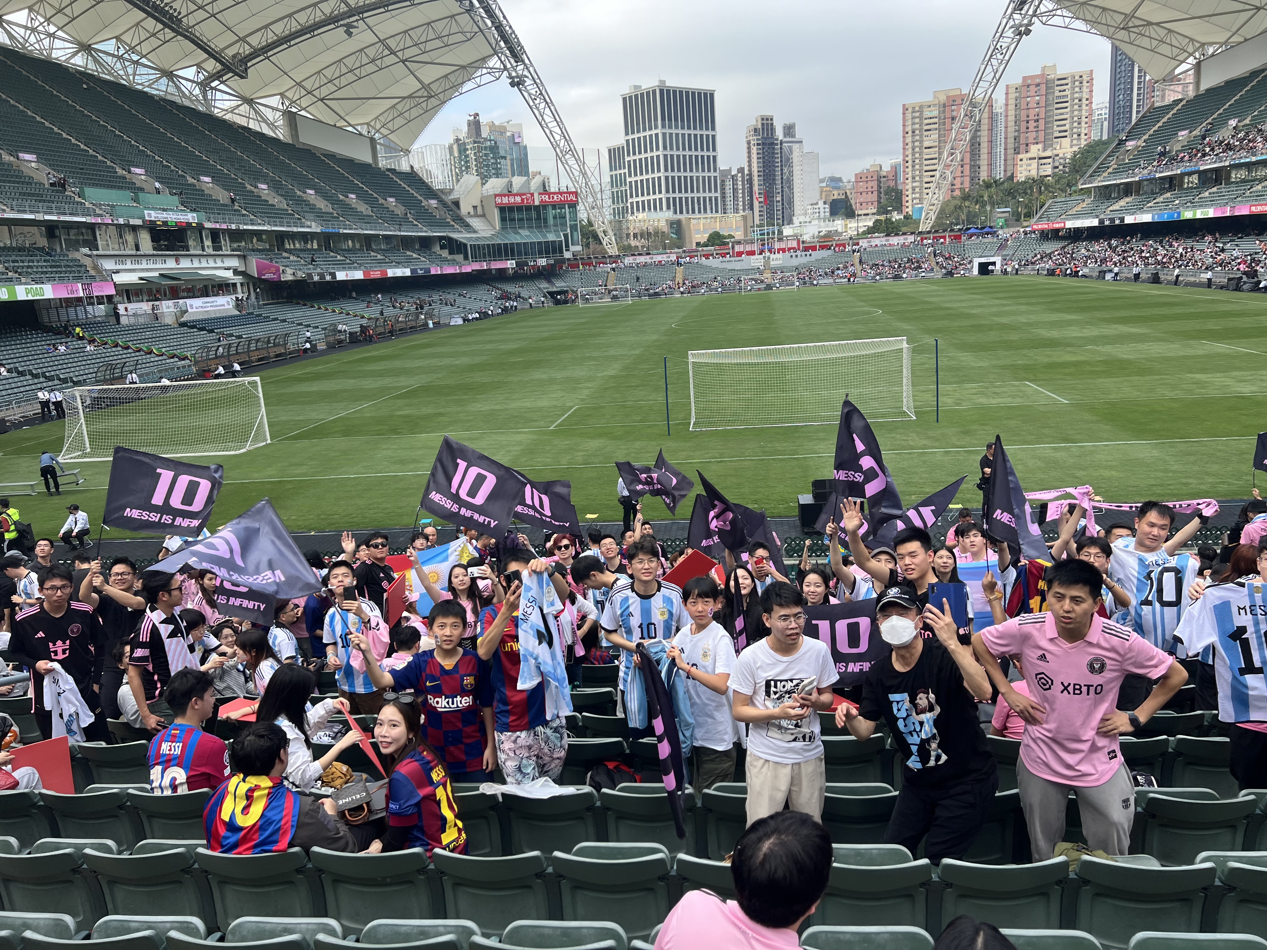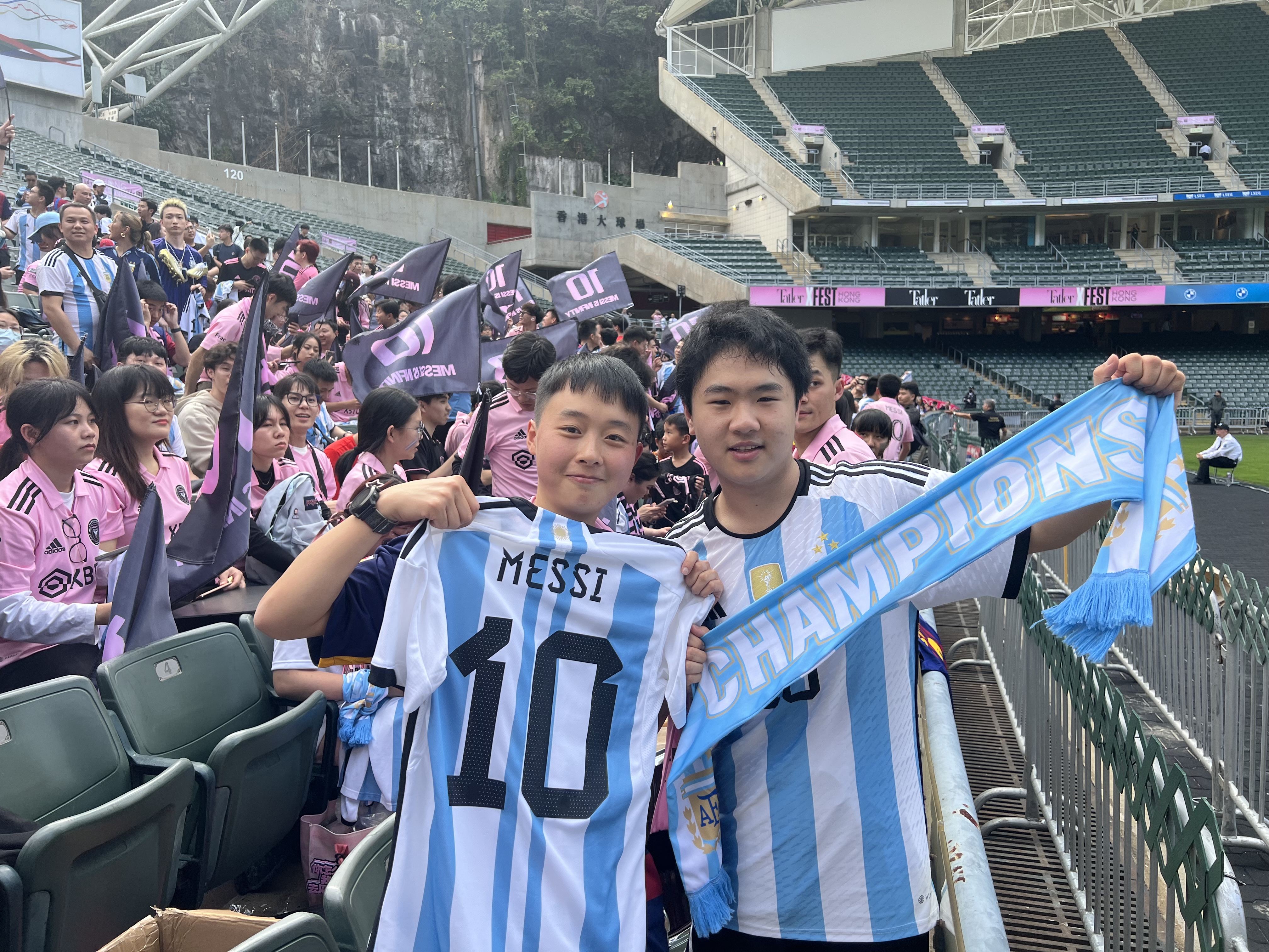 多名球迷一早穿上阿根廷或到國際邁阿密的球衣排隊進場,也有球迷手持希望取得美斯球衣標語,等候偶像會面。不少球迷更是從內地來,其中排頭位的楊先生,今早8時便到大球場排隊,他說,從廣州來港,希望能夠早點入場,佔據有利位置,觀看美斯操練。另外也有內地女球迷自製一些紋身貼發給其他球迷,準備向美斯等球星打氣。
