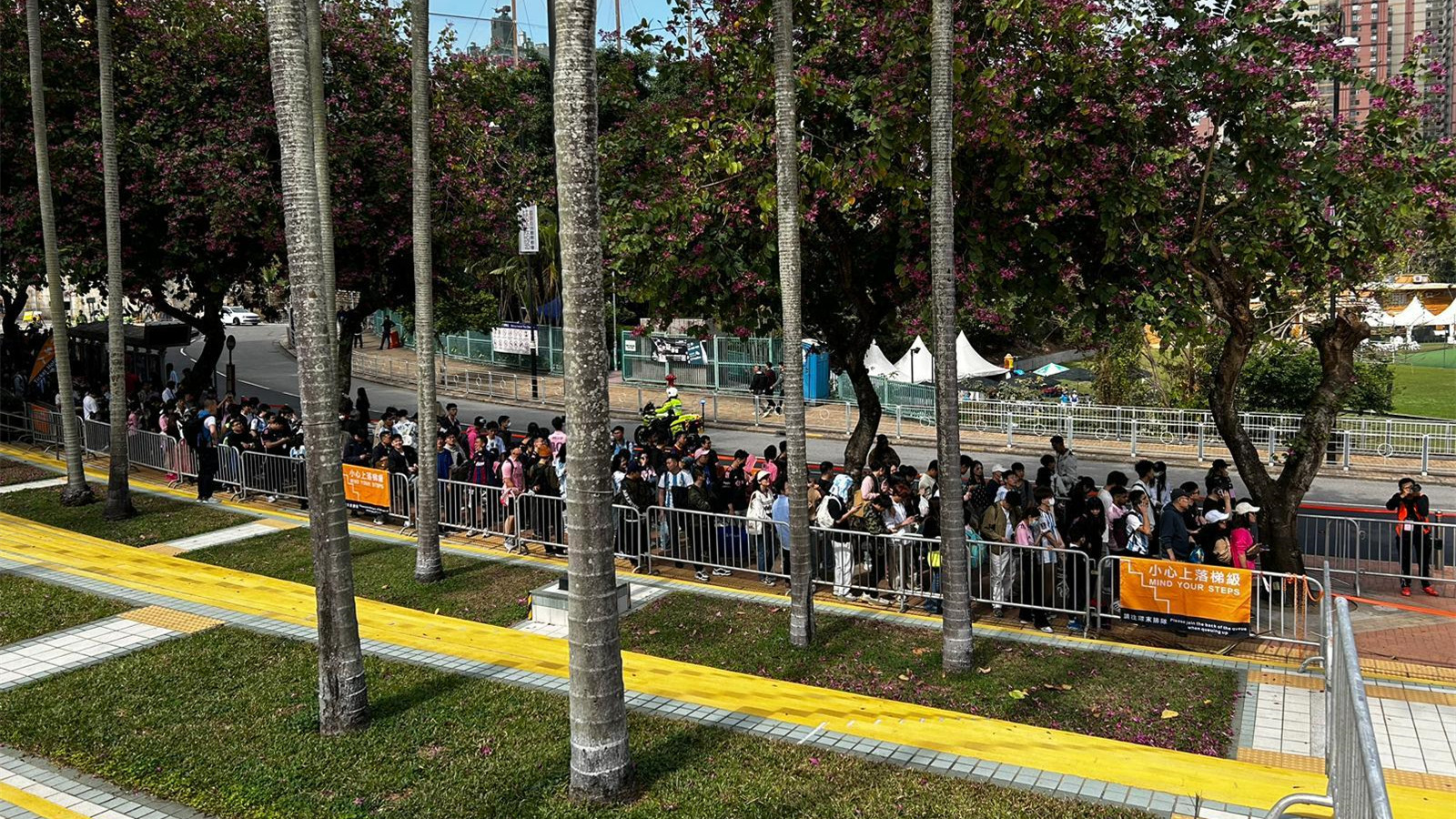 警方早前預料,今日的公開操練和明天的表演賽都會有四萬人次到大球場。現場所見,球迷在進入球場後需要圍繞場館排隊等候入內。