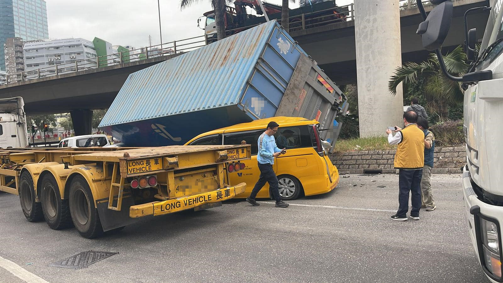兩車被壓至變形並凹陷,消防員到場後恐貨車再進一步將兩車壓扁,先使用支架固定車身後,將被困的貨車司機救出。有乘坐工程車的乘客稱當時突然有車從後方高速駛至,然後壓向他們一方,幸車頂承受壓力,他們則在其他司機協助下從左方爬出車廂後,方知「咁大件事」,對自己只受輕傷感到萬幸。