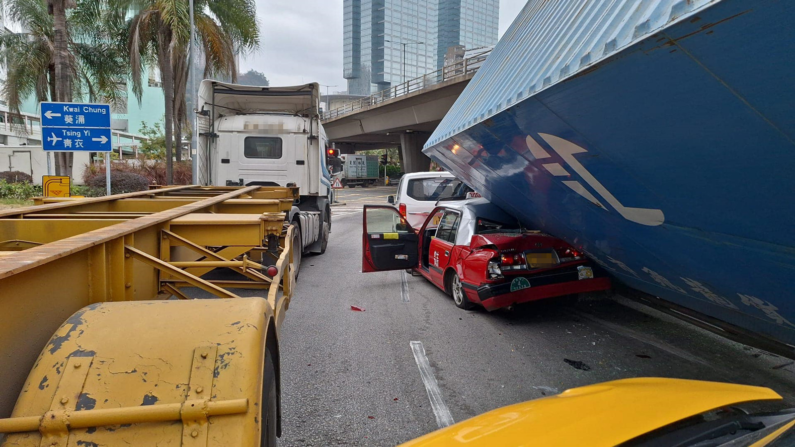 貨車前方壓住一部的士,其後方嚴重損毀。