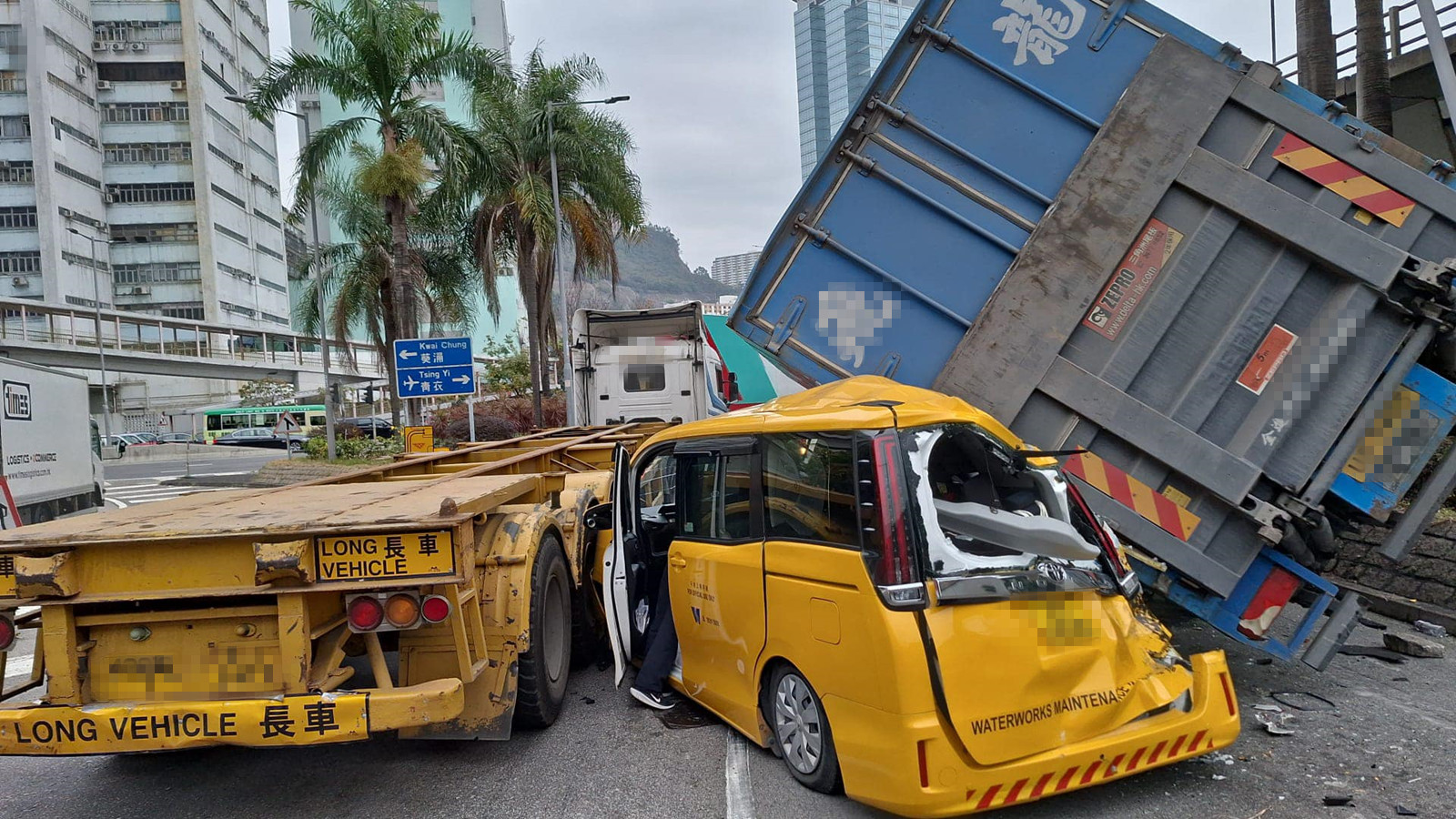 【橙訊】荃灣路下午一時許發生交通意外,其中一輛載滿貨物的貨車剷上花糟後翻側,壓中鄰線的一輛工程車及的士,兩車車架被壓至變形。現場消息指意外涉及六輛汽車,最少三人受傷,貨車司機則一度被困,消防員需先行固定車身後,才將司機救出。受意外影響,由荃灣路(往九龍方向)通往葵青路(往青衣方向) 的支路全線現已封閉。現時上址交通繁忙。駕駛人士請考慮改用其他道路。