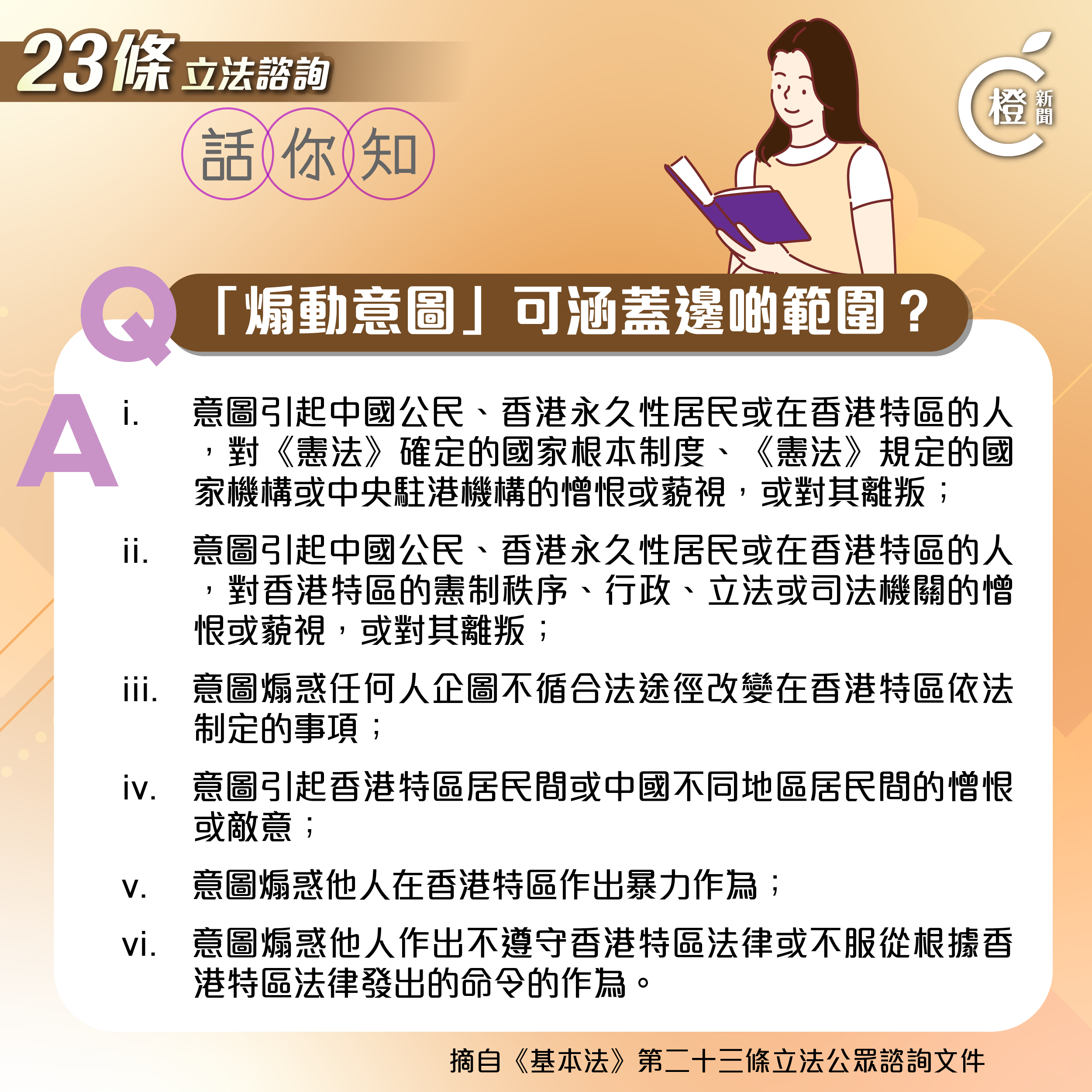 編者按:特區政府展開基本法第23條立法公眾諮詢,不少市民對於諮詢文件中的部分條款多有疑惑。《橙新聞》根據文件製作系列圖表,用簡單易明的方式話你知23條冇咁難明。