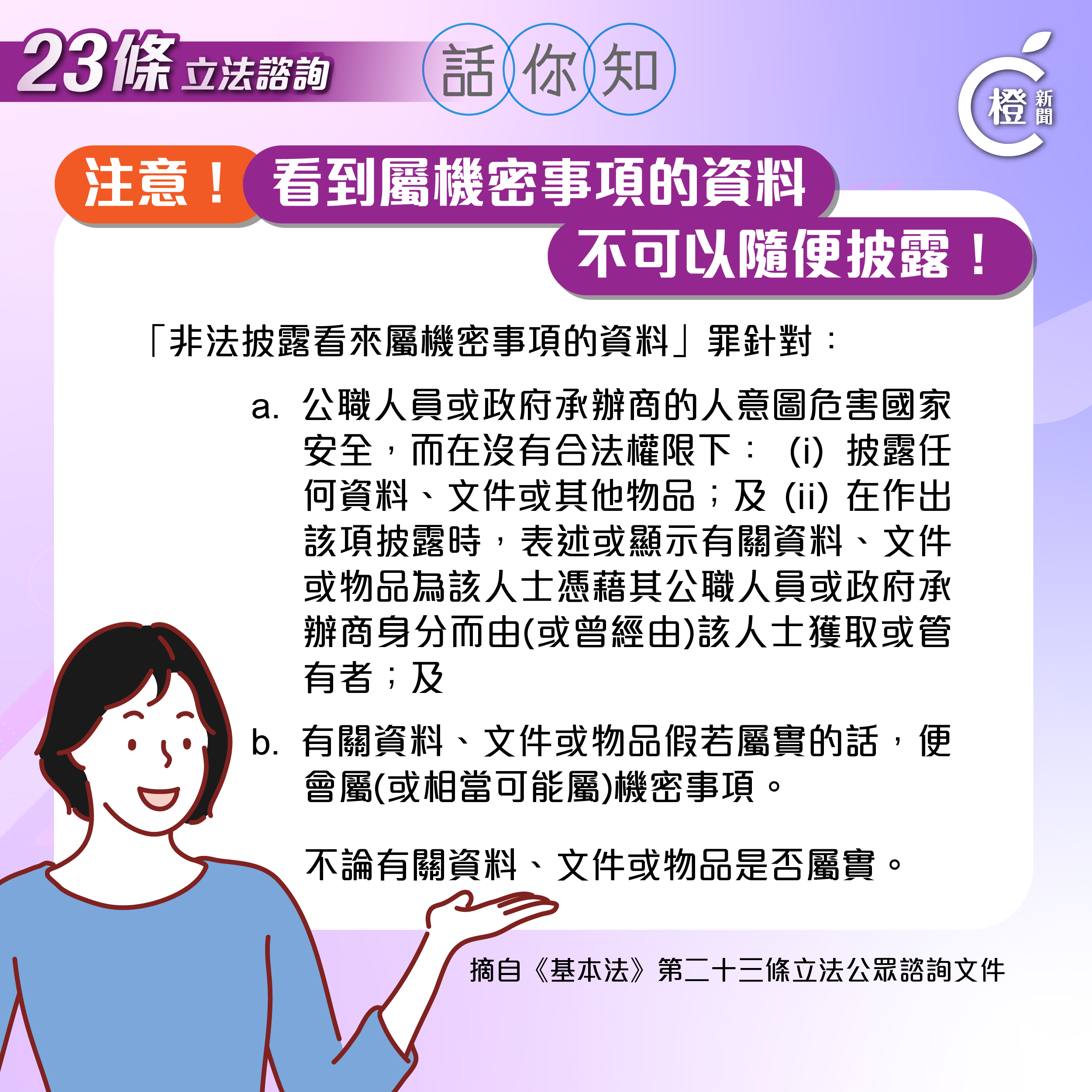 編者按:特區政府展開基本法第23條立法公眾諮詢,不少市民對於諮詢文件中的部分條款多有疑惑。《橙新聞》根據文件製作系列圖表,用簡單易明的方式話你知23條冇咁難明。