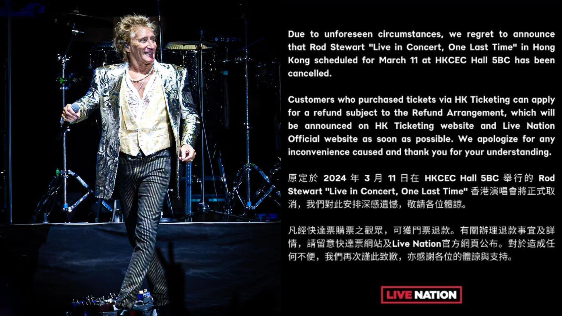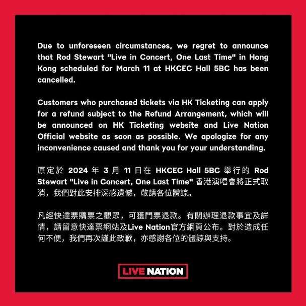 主辦單位Live Nation稍前宣布洛史釗活因「不可預知的理由」,將取消今次演唱會(圖:livenationhk@IG)