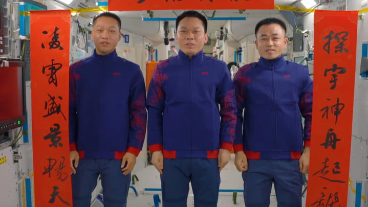 三人是中國載人航天工程進入空間站應用與發展階段後,首個在太空過農曆年的航天員乘組,他們特意穿上新年喜慶的「祥雲服」,又在太空站內貼上春聯,掛起燈籠及福字,繫上紅色的中國結。