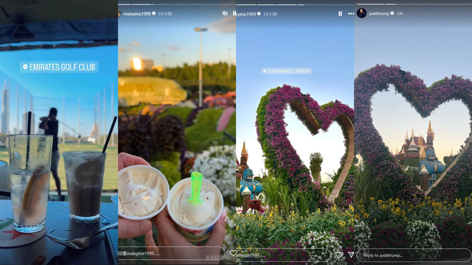 馬曉晴與卓林普兩人昨日均在社交媒體近乎同步打卡,一樣身處杜拜AYA渡假酒店渡假(圖:maisyma1999@IG,juddtrump@IG)