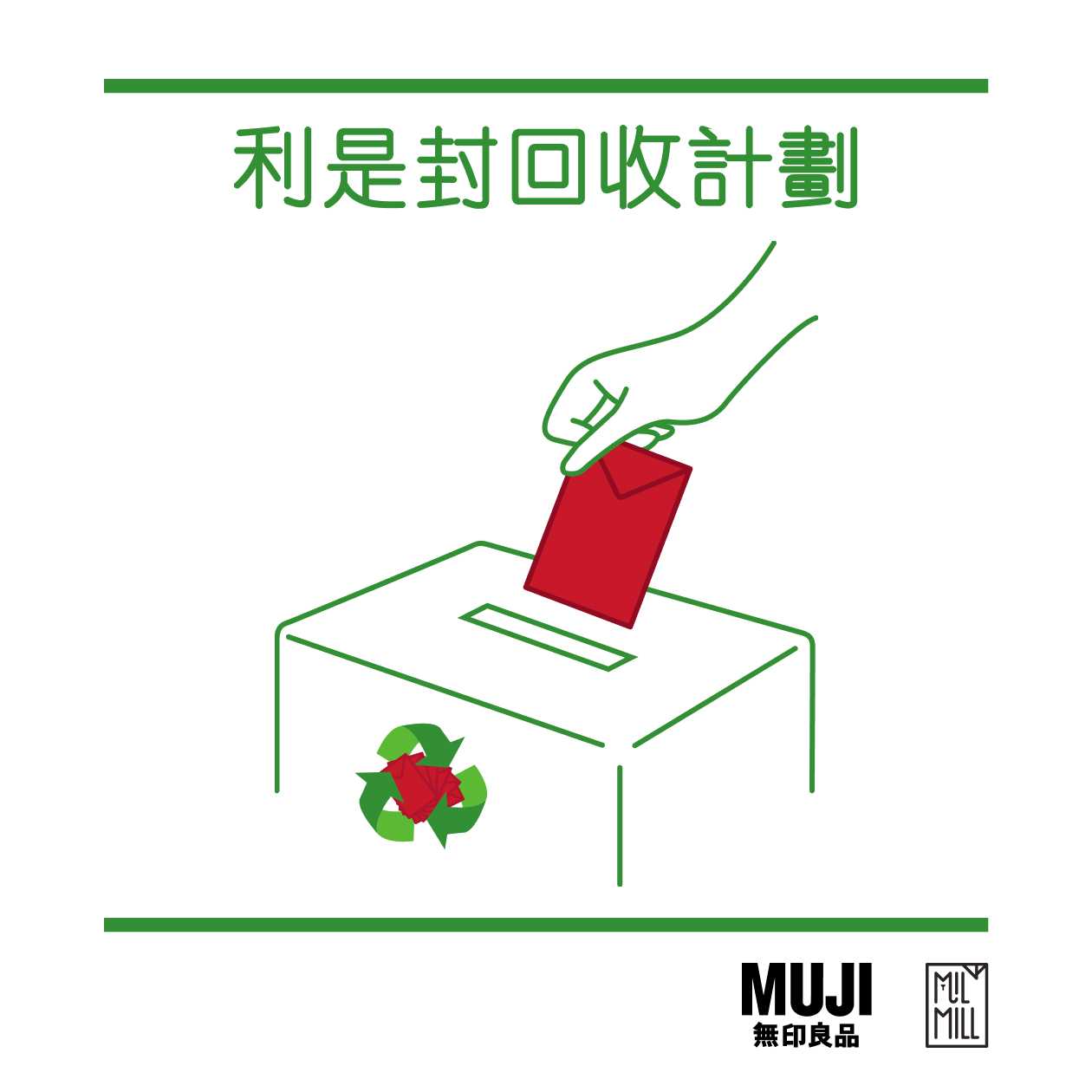 無印良品與Mil Mill 喵坊合作,於各分店設置利是封回收箱,大家可以將拆了的利是封放進回收箱內。無印良品會將這些利是封交由Mil Mill 喵坊循環再造,製成環保產品。