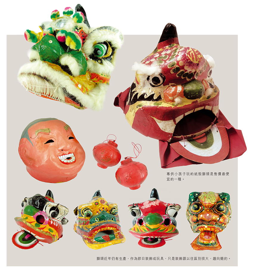 舞獅頭,給兒童玩的是紙撲迷你獅頭,造型概括誇張,配上小型獅鼓、銅鑼及鈸等。大頭佛跟成人用的基本相同,近年造的省卻了竹篾作框架的部分。
