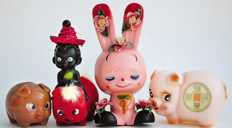 以大紅豬仔錢罌迎接新年是古已有之的傳統,六十年代以塑膠取代缸瓦,造型也以外國卡通豬作藍本。這些大紅膠豬流行了幾十年,已成為新的香港傳統玩具。最右的卡通小豬產自加拿大,是新一代膠豬仔錢罌的指定造型,後來還加上兩個大金錢,新年氣氛更濃厚。