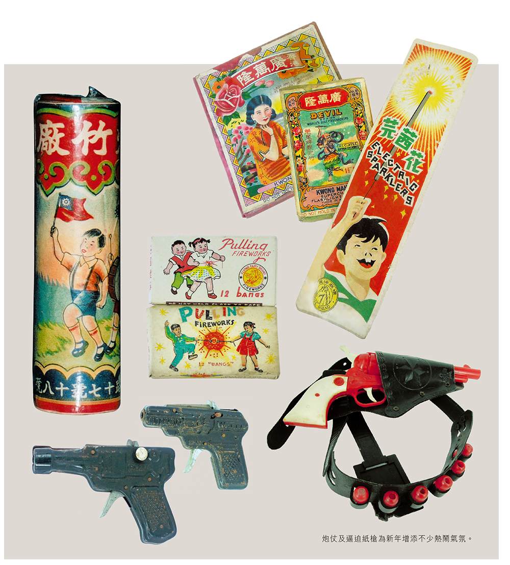六十年代之前,香港每逢過年,燒炮仗是兒童最普遍的玩意,在二十年代有廣萬隆炮仗廠,生產各式電光炮、火箭、煙花等。每逢過年期間,各大小士多都在門前對開擺放兩張板櫈,上放一塊鋪了紅紙的板,擺滿五光十色的炮仗煙花,以吸引小孩花掉身上的利是錢。伴隨炮仗,還有各種打喼紙的牛仔槍、打逼迫紙的鐵皮槍,及各式發彈玩意。