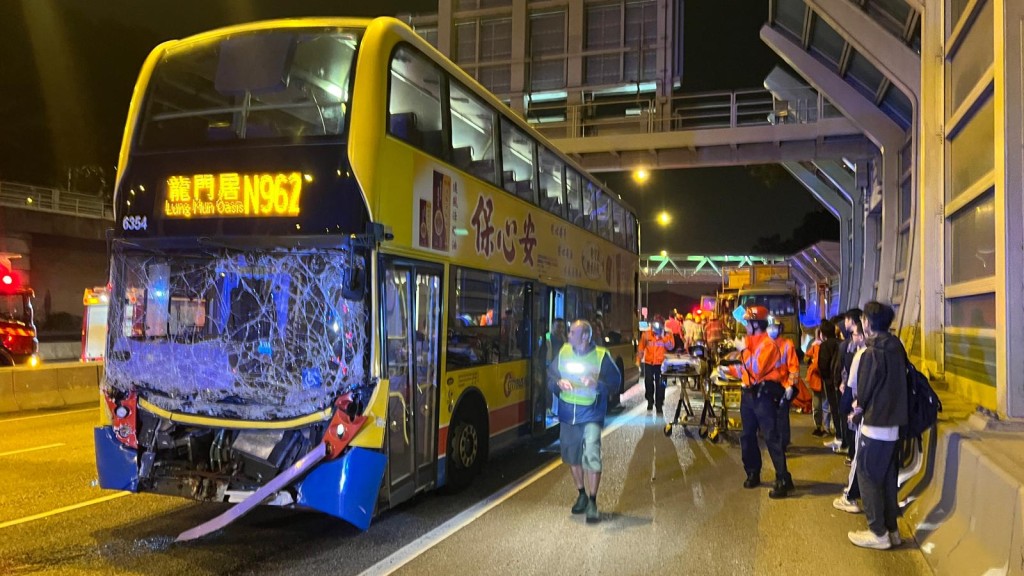 一輛通宵巴士在屯門公路發生交通意外,共10名乘客及司機受傷。
