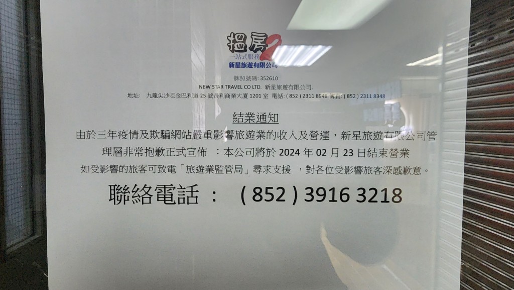 【橙訊】辦公室位於尖沙咀商廈的新星旅遊,在辦公室大門張貼通告,聲稱因疫情以及詐騙網站,嚴重影響旅遊業收入及營運,因此宣布於昨日(23日)結業,並向旅客致歉。然而,通告上未有任何賠償安排,僅著受影響顧客自行致電旅遊業監管局尋求支援。就連通告上的大字電話,也是旅監局的一般查詢熱線。海關及消委會回覆均表示,暫未接舉報或投訴。