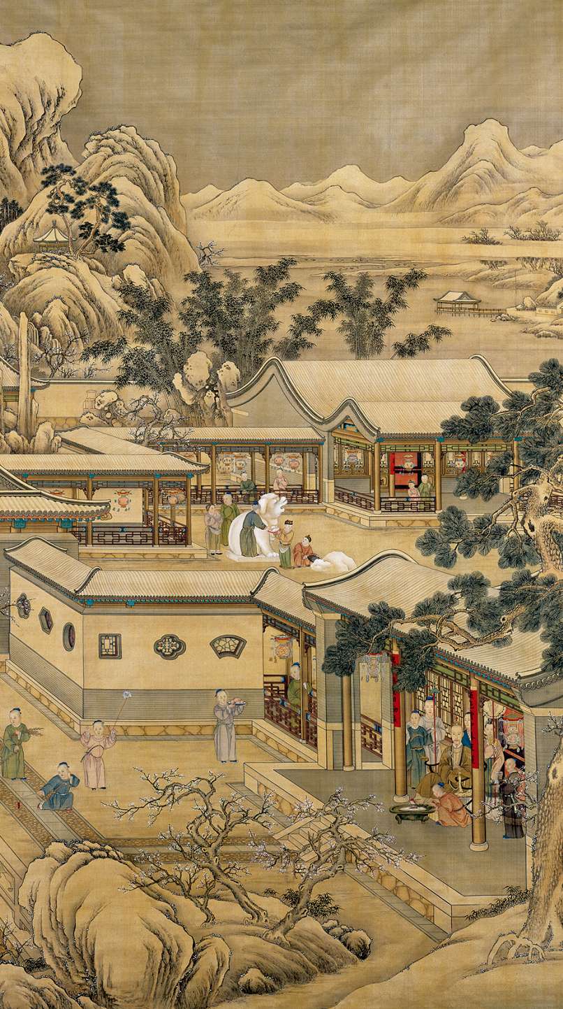 據《清宮檔案》記載,此圖作於乾隆十一年(1746)九月,是專門為歡慶新年而繪製的一幅清宮節令風俗畫。由西洋畫家郎世寧和中國畫家沈源、周鯤、丁觀鵬共同完成。乾隆帝及其家人的肖像當由郎世寧主筆,其他建築、山水、林木等則由中國畫家繪製。