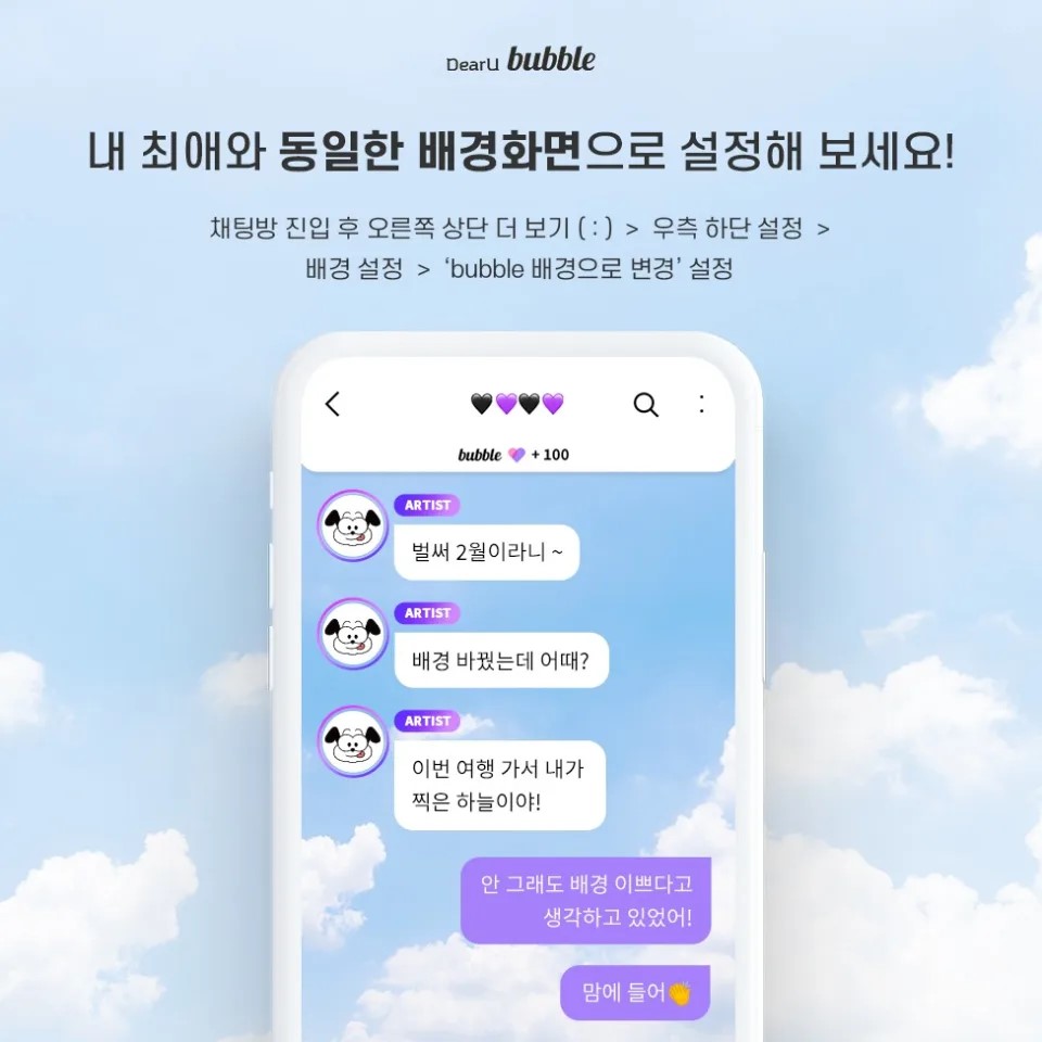 Bubble是一項供藝人和粉絲一對一即時通訊對話的訂閱服務。粉絲可以在聊天室中接收和回覆藝人發送的消息,與以往以帖文形式查看的方式有別。訂閱收費是每位藝人每月4500韓元。入駐藝人包括SM、JYP、Starship Entertainment等公司旗下的idol、演員以及體育明星等。