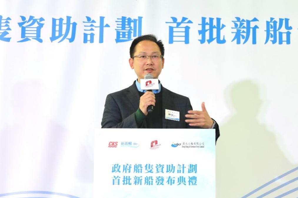 香港立法會議員陳學鋒為下午新船發佈典禮致辭。