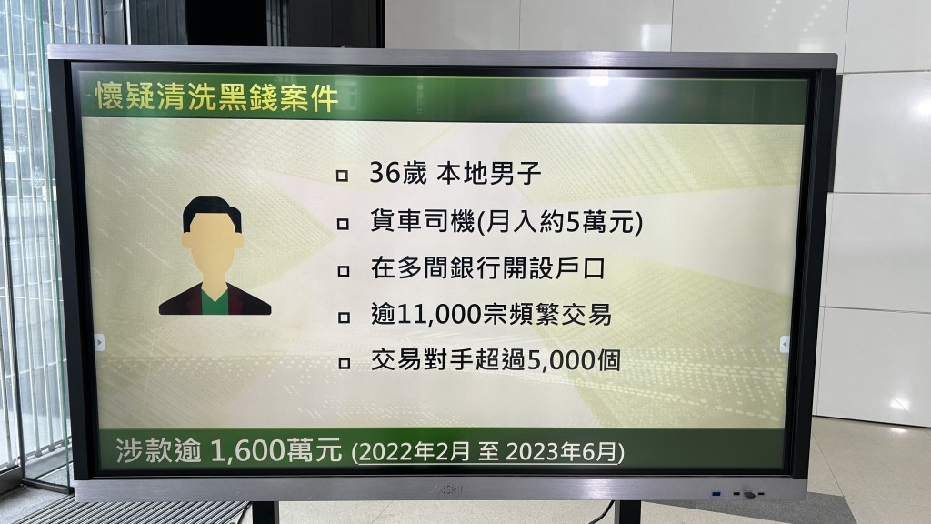 蔣俊傑透露,發現被捕人懷疑利用名下戶口洗黑錢。涉案男子自2022年2月至去年6月期間,在多間本地銀行開立戶口,與超過5000名交易對手進行交易超過1.1萬次,當中有戶口單在一日內進行180多次交易,懷疑資金與他的犯罪活動有關。