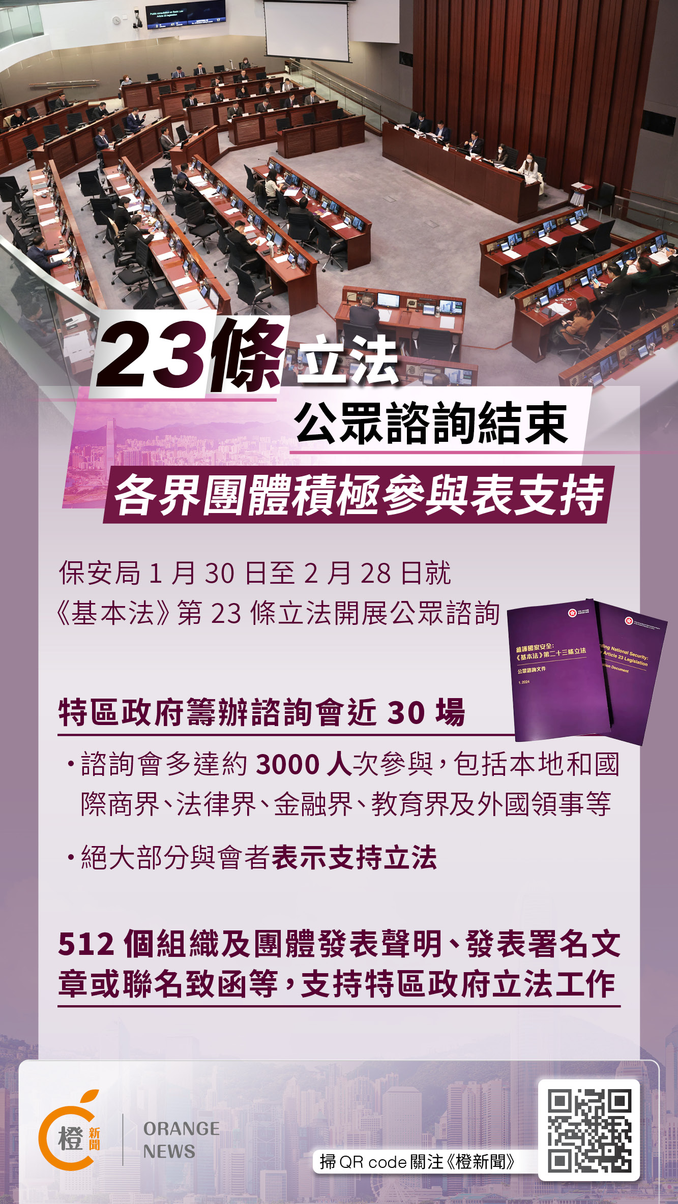 此外,不同界別、不同專業的組織及團體在公眾諮詢期間亦通過公開發表聲明、發表署名文章或聯名致函等方式,踴躍表達支持特區政府的立法工作,截至周二(27日),數目達512個,有部分聲明亦以回應公眾諮詢形式提交給特區政府。